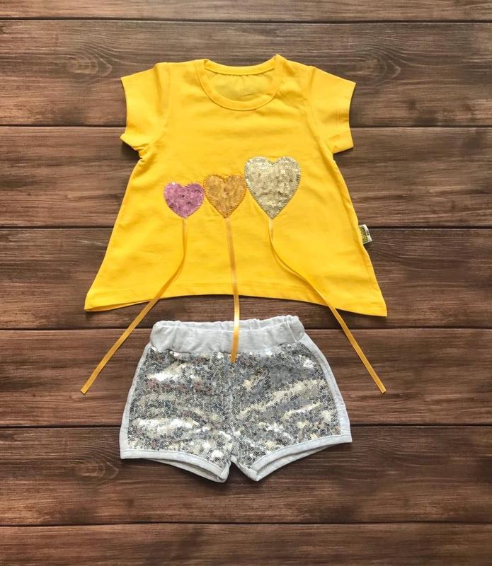 Страна производитель: Турция Костюм "Сердечки" летний для девочки декорирован пайетками и атласными лентами Вік по бірці: 1 год: Футболка: длина по переду 31см/полуобхат груди 25см Шорты (пайетки только впереди!): длина 19см/полуобхат талии (от-до) 18-22см 2 года: Футболка: длина по переду 33см/полуобхат груди 26см Шорты (пайетки только впереди!): длина 20см/полуобхат талии (от-до) 19-23см 3 года: Футболка: длина по переду 35см/полуобхат груди 26,5см Шорты (пайетки только впереди!): длина 21,5см/полуобхат талии (от-до) 20-24см