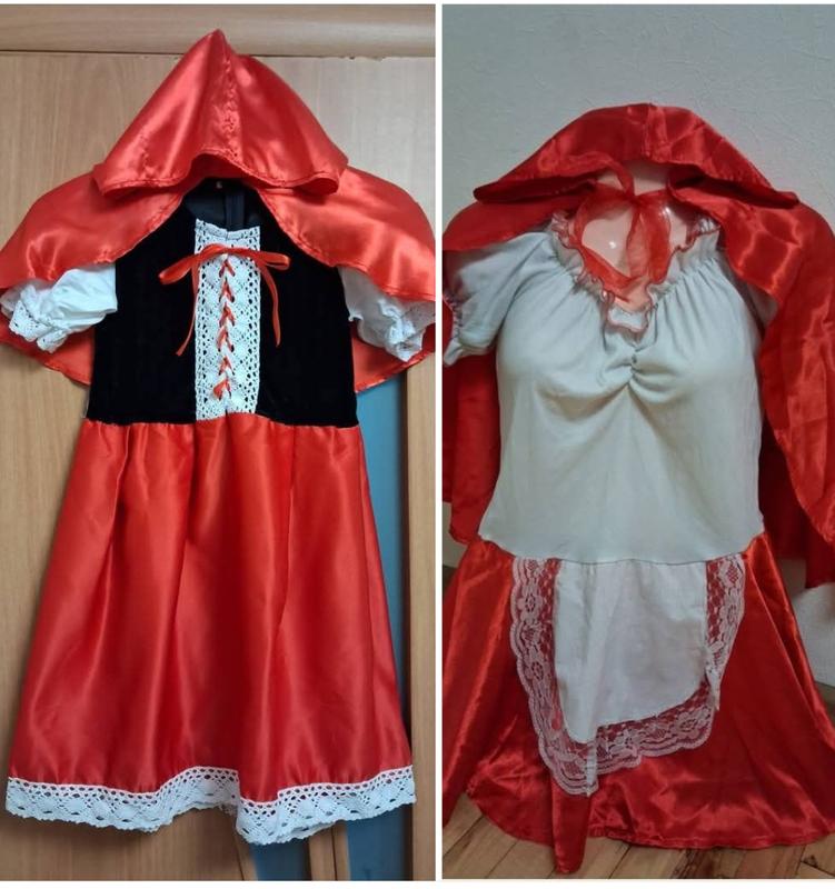 Шикарный карнавальный костюм Красная шапка. Платье и красная накидка с капюшоном (один на выбор). Платье верх велюр, тянется. По спине молния. Размер указан 140 см. Пог-38-40, Пот-40, длина 75 см. Цена 250 Яркое платье с накидкой на подростку. Платье можно носить с приспущенными плечами. Состояние красивое. Платье по спине вшито. Размер указан small Пог-40-44, длина- 70. Цена 150 Есть красные колготки, цена 50 грн