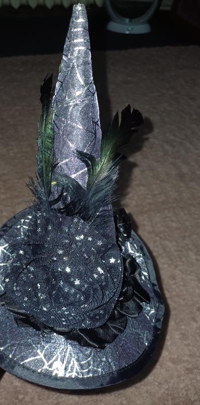 высота 23 см. декорирована лентами, перьями, паутина рисунок. крепится на ободке. для утренников, вечеринок, карнавалов.