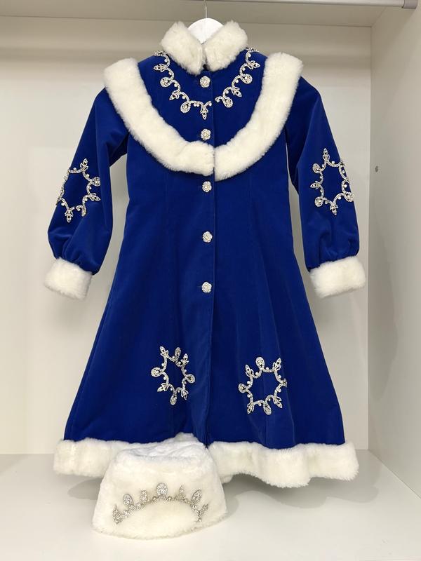 Костюм Снігуроньки для дівчинки 5-6 років Пошитий на замовлення Шапка: Обхват голови 43-44 см Пальто: Напівобхват грудей 35 см Напівобхват таліі 35 см Довжина рукава 50 см Довжина виробу 80 см