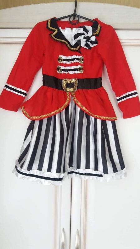 Яркое карнавальное платье в пиратском стиле для маленькой авантюристки. Особенности: • Красный цвет с черными акцентами • Декоративные золотистые элементы и тесьма • Черно-белые полосатые вставки • Пояс с декоративной пряжкой • Белые кружевные детали на груди Материал: текстиль, атлас Размер: на ребенка 4-6 лет Состояние: красивый Без бирки производителя Идеально подходит для костюмированных вечеринок, карнавалов, детских праздников и тематических мероприятий.