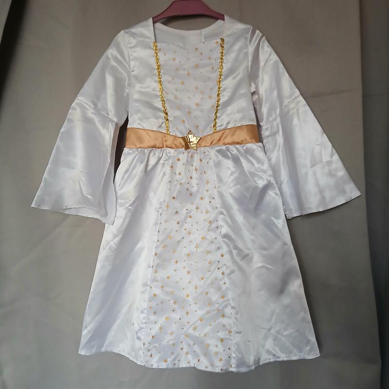 білосніжно біла атласна сукня, дитячий карнавальний костюм для образу ангел або зірочка, завдяки золотим акцентам та візерункам у вигляді зірок, на 3-4 роки. Колір: Білий із золотистими елементами. Дизайн: Сукня має довгі рукави-дзвіночки, золотистий пояс із пряжкою та розсип золотих зірочок по всій довжині спідниці. Використання: Такі сукні популярні для новорічних свят, різдвяних вистав, ранків та маскарадів. заміри довжина 65 ширина по грудях 27 ширина по талії 27-29 плечі 24 рукав 37 спереду знизу трошки морщить атлас під фатином, третє фото стан ідеальний, товар секонд люкс