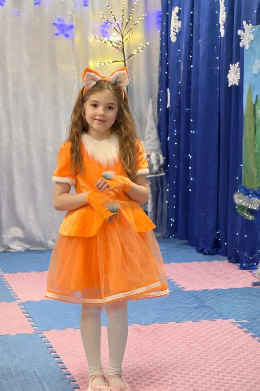 Сукня костюм лисички На розмір 116-128 підійде На спинці шнурівка Хвостик пришитий Рукавички та обруч з вушками в комплекті Дуже гарний