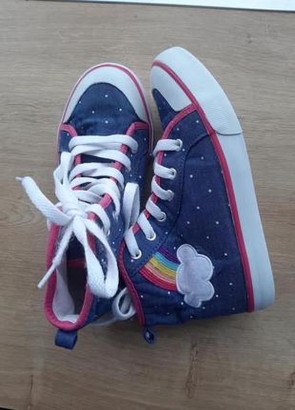 Джинсовые высокие кеды Gymboree с яркой аппликацией радуга. Обуты на 1 час. Стан НОВИХ. Следов носки нет. Размер американский 1,5 или 31-32.