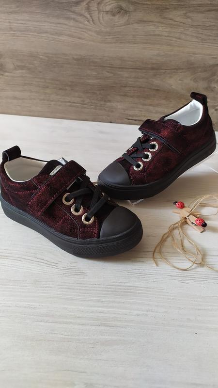 Кеды с лазерным напылением для девочки на липучке. Подойдут для ежедневной прогулки теплой осенью или весной. Цвет - темный марсала. Внутри кожа, супинатор Размеры и замеры стельок: 26-16.5см 27-17.0см 30-19.0см