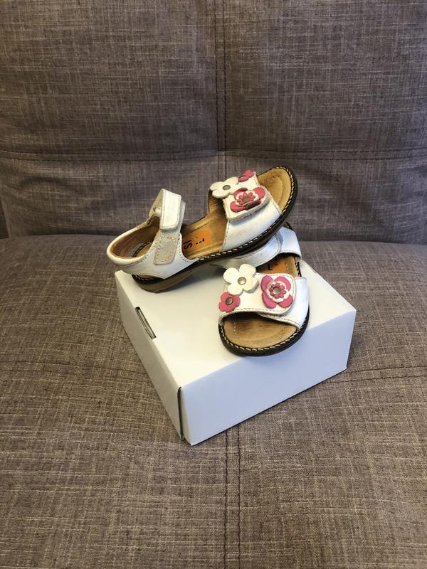 Шкіряні зручні босоніжки. Застібка - міцна липучка, регулювання повноти ніжки теж на липучці. Устілка - 16 см Є ушкодження з самого краю зовнішнього боку задньої частини підошви. Віддам у подарунок при замовленні від 100 грн.
