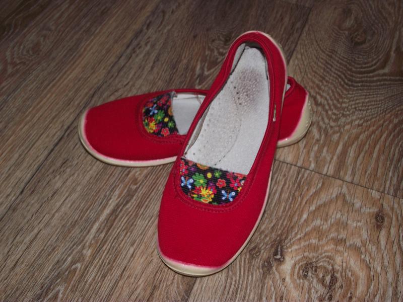 Очень классные мокасины-тапочки. 32 размер. По стельке 20 см. Стелька кожа с супинатором - вынимается. Стельки постираны, просто из-за того, что кожа - не белоснежные( Можно заменить без проблем. И подошва (боковушки) немного подкрасились в красный цвет от ткани. На фото видно. Сами мокасины в очень хорошем состоянии - носили мало. Мокасины легко стираются в машинке - быстро сохнут. Очень удобные и легкие. Цветная вставка - резинка - для удобства одевания. Для двора бегать - будут то, что нужно! На ножке супер!