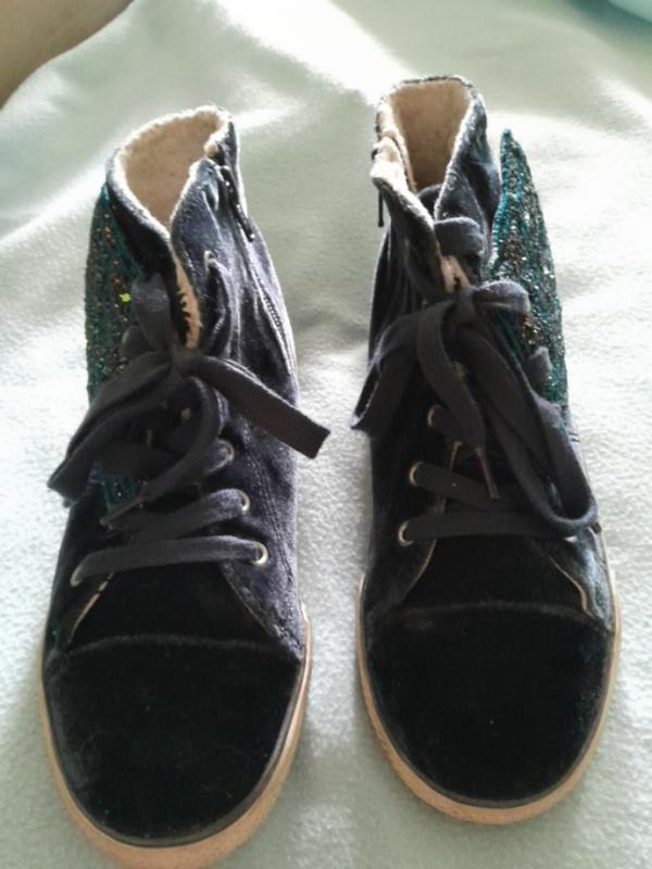 По наборке 34,5 размер, поверхность - штучный бархат, темно-синий цвет,на замочки и шнуровки. Имеют утепление--фото 7,8, но только к пальцам в лилке пальцев - без утепления. По потолке 22см, по подошве 23см--фото10