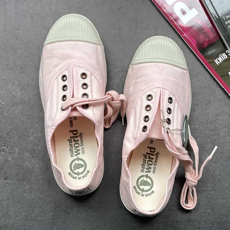 Текстильные кеды Natural World (Испания) Испанский бренд Natural World Eco - это стильный дизайн, удобство, легкость и только экологически чистые материалы! верх натуральный "дышащий" ароматизованный хлопок (100 % organic cotton) подкладка натуральный хлопок мягкая комфортная стелька EVA гибкая мягкая резиновая подошва система фиксации: шнуровка цвет розовый страна производства Испания EUR 35, длина стельки 22 см