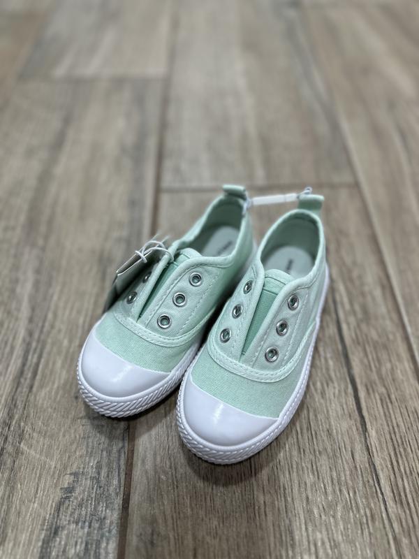 Детские хлопковые кеды, подойдут и мальчику и девочке, супер дыша модель на лето, сверху текстиль, прорезиненные носочки цвет нежно зеленый, размер 24-25(16см), 27(17см)