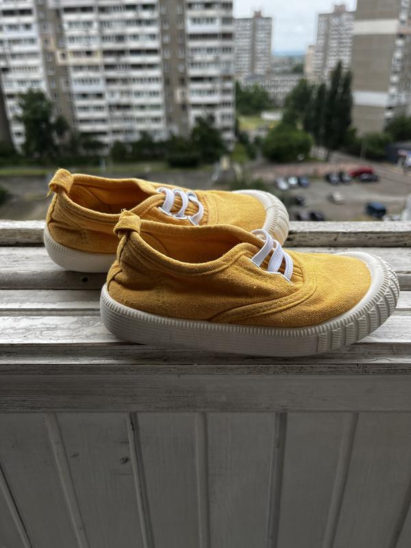 Очень классные яркие кеды для малышей. Подойдут и мальчику, и девочке. Стан идеален, разве не немножко сдерта эмаль на отверстиях для шнурков(на фото есть). Размер пишет 26, но подойдет где-то на 24. Стелька 15 см.