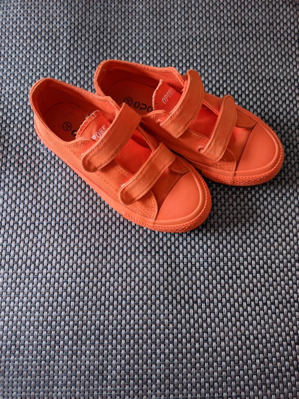 Оранжевые кеды для девочки или мальчика на липучках, однотонные без рисунков. Подошва гибкая.Легенькие, удобные, подходят для прогулок, танцев, или физкультуры. По детальной информации воспользуйтесь приватом.