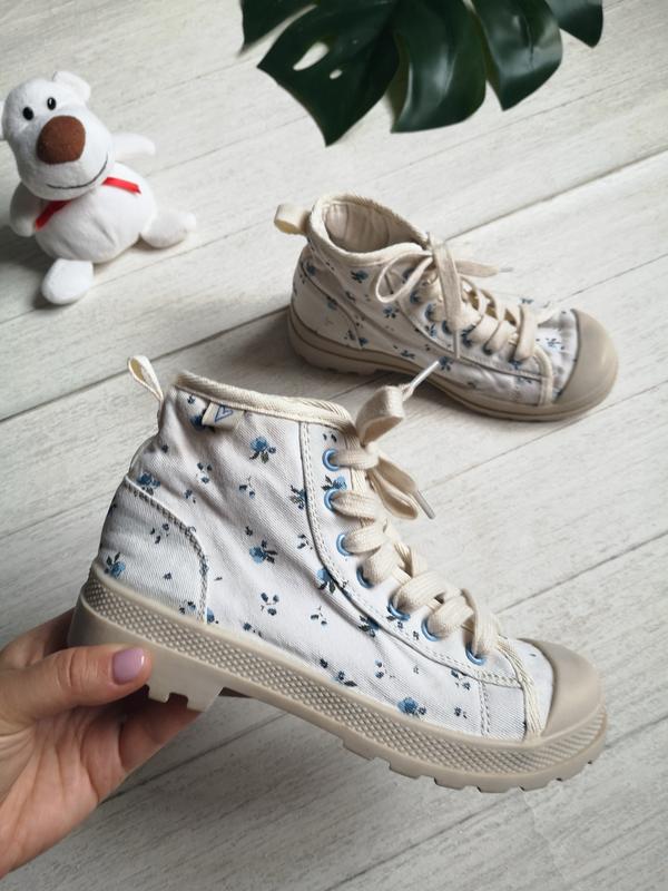 Класні високі кеди на шнурках у квітковий принт. Стан ідеальний, носили мало. Заявлений розмір 1 = 33. Довжина устілки 21,9 см.