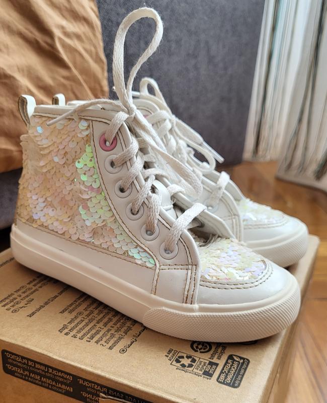 кеды на девочку,пайетка не стерта,в идеальном состоянии, но есть дефект (см.остановочное фото), не заметно, и при носке также не заметно. длина 17-17.5 см