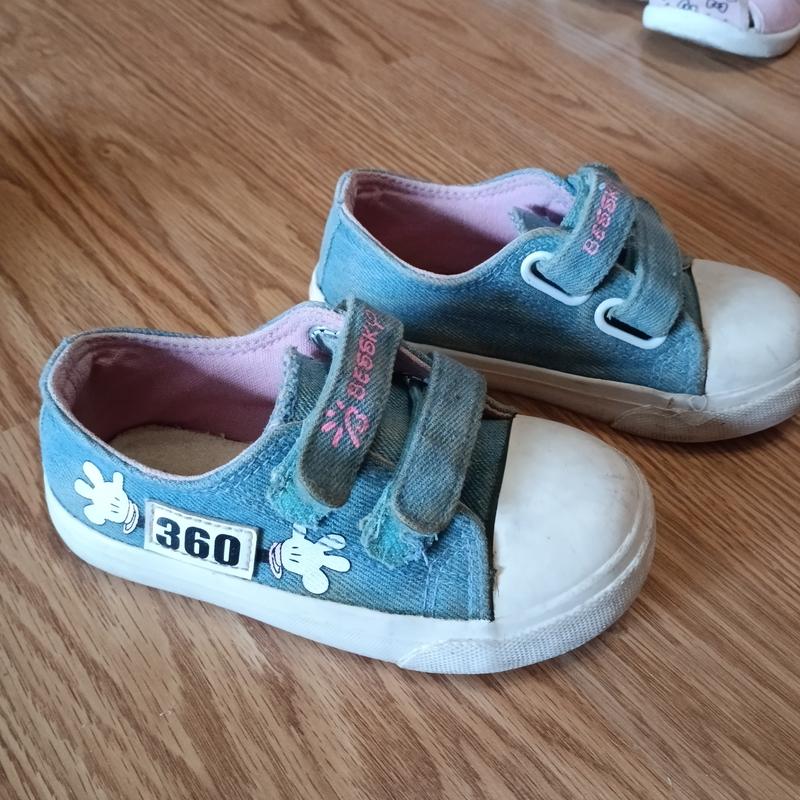 Кеды джинсовые для девочки.. Мысок укреплён резиной. Две рабочие липучки. Размер 25, длина стельки 15,5. В идеальном состоянии.