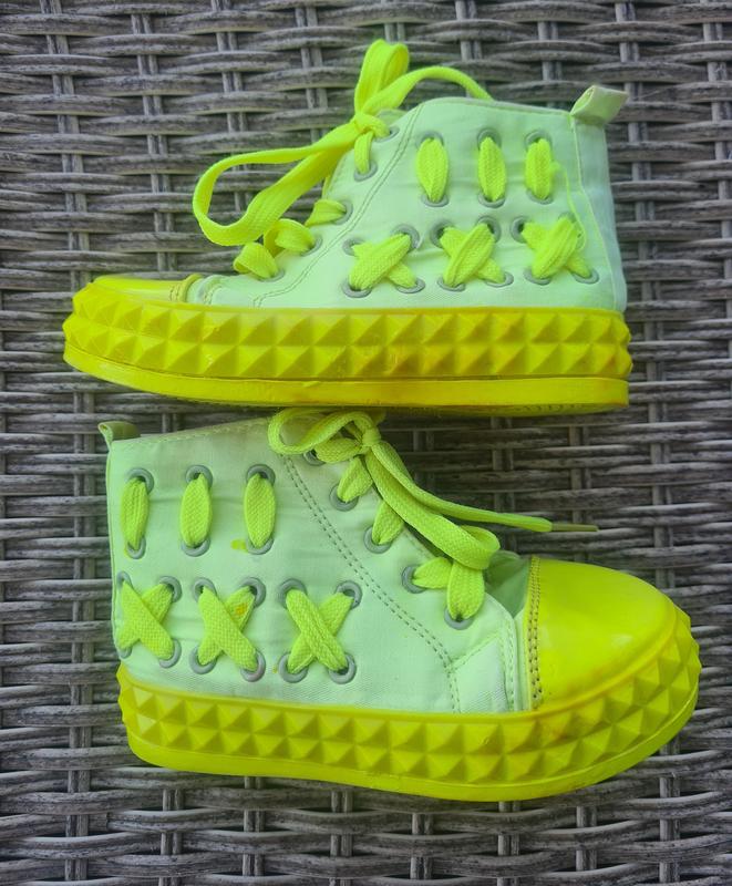 Текстильні кеди яскравого лимонно-лаймового кольору. Підошва з декором типи шипи. На шнурках, застібка- блискавка. Стан добрий, все на фото - є трози вицвітвння кольору тканини, але воно рівномірне і загалом не видно. Також є місця потемніння на підошві, на фото показано. Устілка - 17 см. Тканина верху на дотик -бавовна.