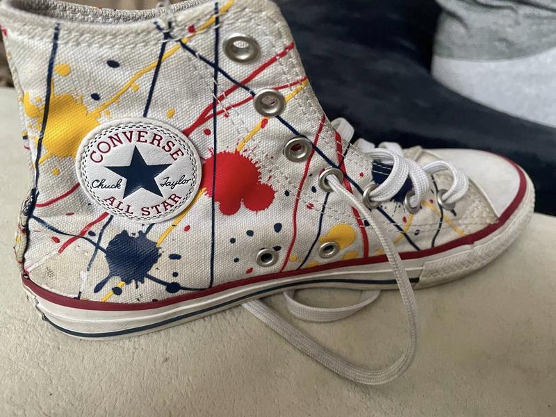 Продаю оригінальні високі кеди Converse у дуже крутому та рідкісному дизайні. Це не просто взуття, а справжній арт-об'єкт, який виділить вас із натовпу. Дизайн натхненний технікою абстрактного експресіонізму (у стилі Джексона Поллока). Матеріал: Якісна міцна парусна тканина (canvas), яка легко чиститься. Підошва: Класична вулканізована гума з фірмовим протектором (чудове зчеплення).