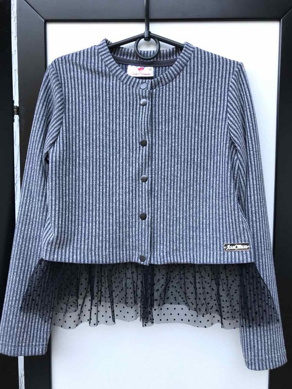 Школа 🏫 М. 344. Кофта «Мілєна» 🧶Трикотаж рубчик- приємний до тіла, якісне полотно, середньої щільності ✔️Прямого крою, злегка укорочена довжина ✔️Центральна застібка на кнопках ✔️По низу пришита рюша з сітки-флок в горох ✔️Ніжна - аксесуар під любий одяг ✔️Розміри повномірні 🎨колір : синій меланж Розміри 146 152 158 164 тс -3 🔥💛💙🇺🇦