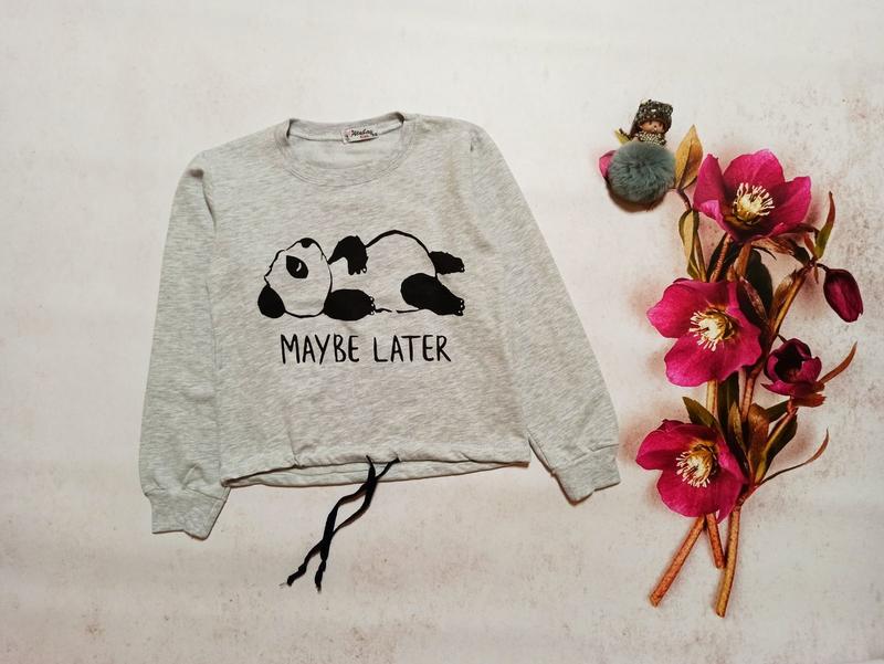 Укрочена кофточка з начосом і принтом Пандочка Туреччина двунитка з начосом знизу регулюється шнурочками сірий колір маломірять, звірка по замірах обов'язкова розміри: 9-10, 10-11 . Заміри зроблені по 1 ростовці, можлива похибка ± 2 см: 9-10: довжина рукава від шва плеча до низу- 46 см, ширина між подмишками- 37 см, довжина від шва плеча до низу- 41 см 10-11: довжина рукава від шва плеча до низу-44 см, ширина між подмишками- 39 см, довжина від шва плеча до низу- 42,5 см