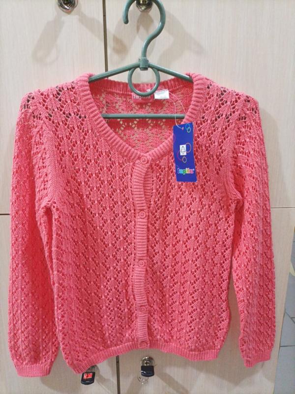 Нова гарна кофта для дівчинки з натуральної тканини. Колір кораловий. Склад :100 % бавовна. Спереду ряд гудзиків. Зріст 110/116 см(5/6 років): Довжина - 43 см ПОГ - 33 см Плечі - 27 см Рукав від плеча - 44.5 см Доставка: Нова пошта Укрпошта.