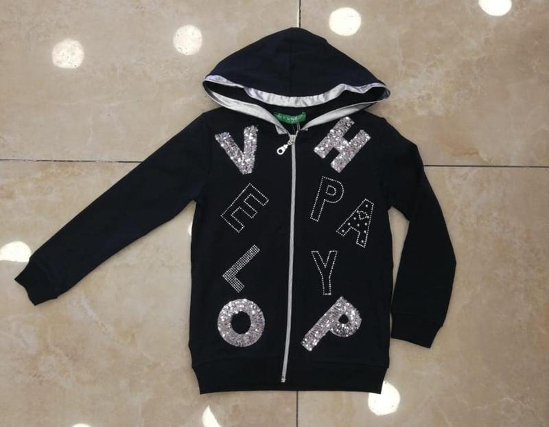 Стильний худі для дівчат на блискавці темно синього кольору з принтом та вшитими паєтками. Кофта дуже зручна та приємна до тіла. Можна носити як верхній одяг. Матеріал бавовна. Виробник Туреччина фірма Cichlid