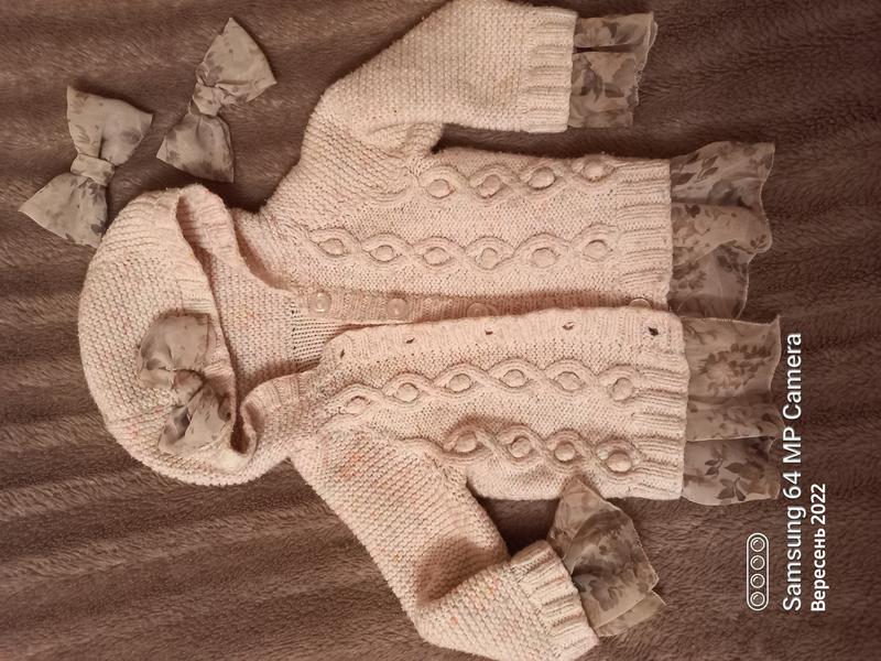 в'язена кофточка. Фабрична без бірок,але я сама прикрасила шифоновою оборкою і бантик на капюшон. І є 2 бантика заколочки. Кофточка з люрексовою ниткою. 5 ґудзиков. Довжина по спіну 28см + 6 см оборка. Довжина рукава від ворота 33 см +6 см Рукав від піхви 20,5 см +6см.Ширина спинки від піхви до піхви 35 см. Речі моєї дитини .