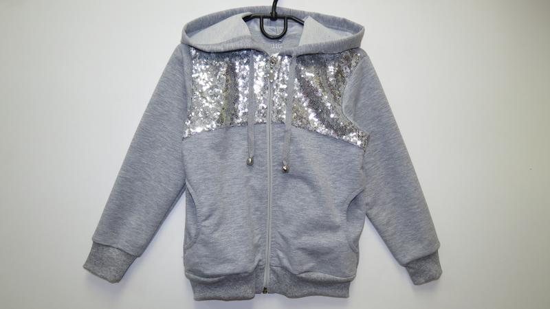 Кофта для дівчинки з капішоном на змійці з двома карманами. Тканина: двонитка. Декор: пайєтки Зріст 116см довжина від плеча по боковому шву – 46.5 см, ширина виробу–36.5 см, довжина рукава від плеча –42.5 см.