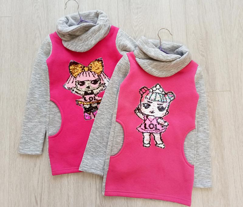 Тепленька тунічка для принцес Лол нашита, паєтки змінюють колір тринитка з начосом перед рожевий, спинка сіра більшомірить!!!! орієнтир за вимірами розміри: 98,104 Виміри зроблені по 1 ростовці, можлива похибка +-2 см: 98: довжина рукава від шва плеча-41 см, довжина від шва плеча до низу-49,5 см, ширина між ручками-29 см . 104: довжина рукава від шва плеча-42,5 см, довжина від шва плеча до низу-51,5 см, ширина між ручками-31 см.