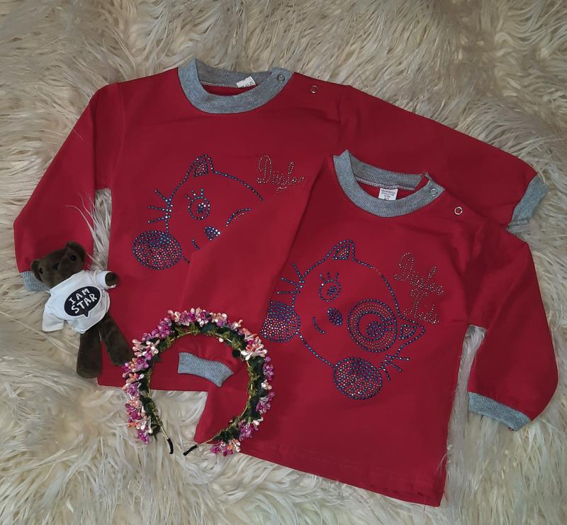 Кофта, реглан на дівчинку 1 - 2 - 3 роки. Колір: насичено червоний, сірий манжет. Нові. Зріст указаний на бірці 92, 98, але можуть маломірить, дивіться заміри. На плечі застібається на кнопки. Тканина всередині ворсиста, утеплена. На одній кофті, зріст 92, немає трьох стразів, буде знижка. Заміри: на зріст 92см. плечі - 25 см. рукав від горловини - 31см. рукав від плеча - 25см. довжина - 35см. шорина - 27см. на зріст 98см. плечі - 27см. рукав від горловини - 33см. рукав - 26см. длвжина - 38см. ширина - 28 см.