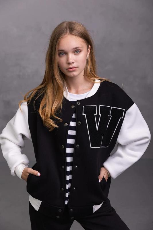 Стильний бомбер для дівчаток Застібається на кнопки. Є кишені. Тканина - турецька тринитка на флісі. Якість відмінна! РЕКОМЕНДУЮ! Розміри повномірні -оверсайз Заміри:довжина\ПОГ\рукав від горловини 134-54\45\62 140- 55\45\64 146-55\46\64 152 -58\48\69 158- 62\51\71 164-62\51\74