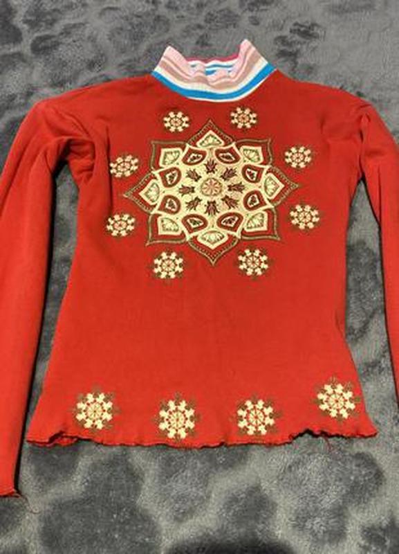 Фото на тілі немає Комір гольф у смужку Рукави довгі на них тоненькі рюшки і знизу кофти також Попереду малюнки в абстрактний принт Тягуча,щільність середня Сліди носіння незначні на фото видно не критично у ціні воаховано Підійде на 5-8 років орієнтуйтеся по замірах Довжина 42 см ) Плечі 38 см) Пог 36 см) Піт 32 см) Знизу 36,5 см, Рукав 41 см)