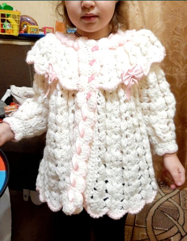 Тепла кофта-накидка вільного крою, з крупної в'язки. Виглядає дуже святково. Стан нової, але без бірки. На 4-6 років