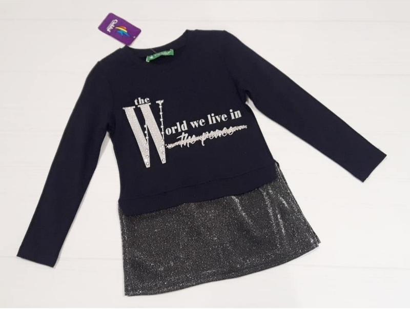 Стильний реглан-туніка на дівчат темно синього кольору з принтом та вставкою з люрекса. Реглан дуже приємний до тіла та гарно виглядає вживу. Можна одягати як під лосіни так і брюки. Матеріал бавовна, люрекс. Виробник Туреччина фірма Cichlid