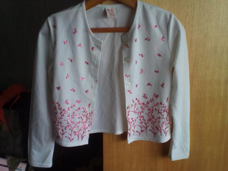 Кофточка на дівчинку.Прикрашена вишивкою з стеклярусу.Довжина по спинці 42 см. Довжина рукава 51 см. Ширина від пройми до пройми 42см.Ширина по низу 80 див. На спинці зачіпка.На рукавах катишки.Фото рукавів скину,якщо кофта зацікавить.