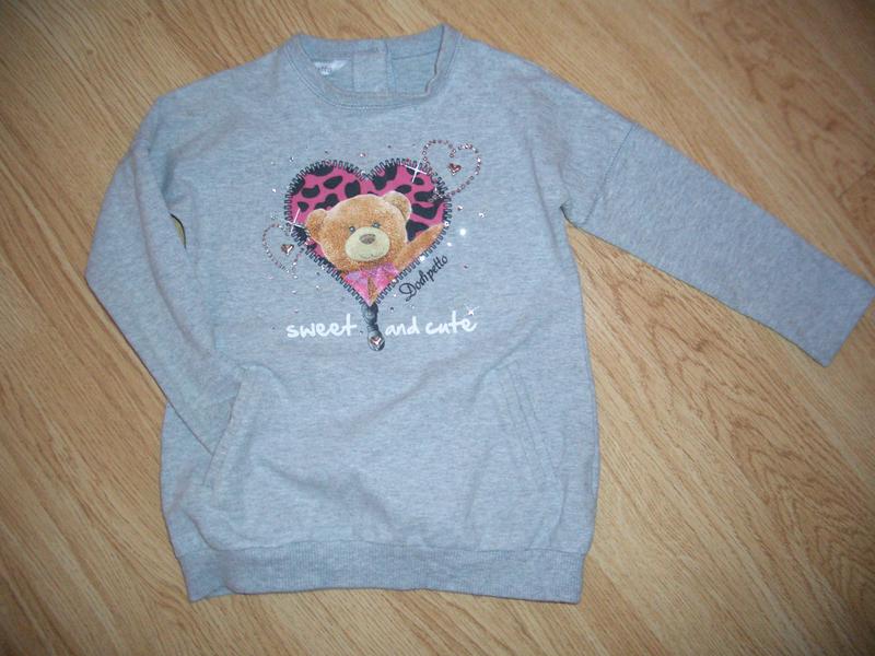 Красивая и удобная кофточка на 30 мес., рост 96 см .Фирма dodipetto. Есть 2 карманчика. Рисунок качественный, на сердечках есть все камушки. Длина 41 см, ширина 29 см, рукав от воротничка 38 см. Сзади есть 3 пуговички, удобно при одевании.
