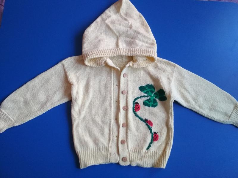 Кофточка для девочки с капюшоном размер 5/6 лет. Смотрите замеры: длина кофточки от горловины 38 см, длина рукава от плеча - 34 см.