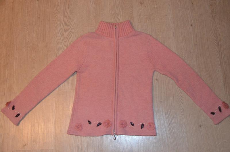 Теплая кофта для девочки в хорошем состоянии. Недостаток - легкие потертости на локтях, особо их и не видно. Без куташек! Молния расстегивается в две стороны. Украшена бусинками и бисером. Длина - 50 см Длина рукава - 51 см Ширина плеч - 33 см Ширина груди - 36 см