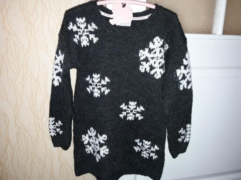 Теплый свитерок девочке по бирке на 6-7 лет ,в реальности очень хорошо смотрится, снежинки украшены стразиками .Состояние нового.Очень практичный для школы