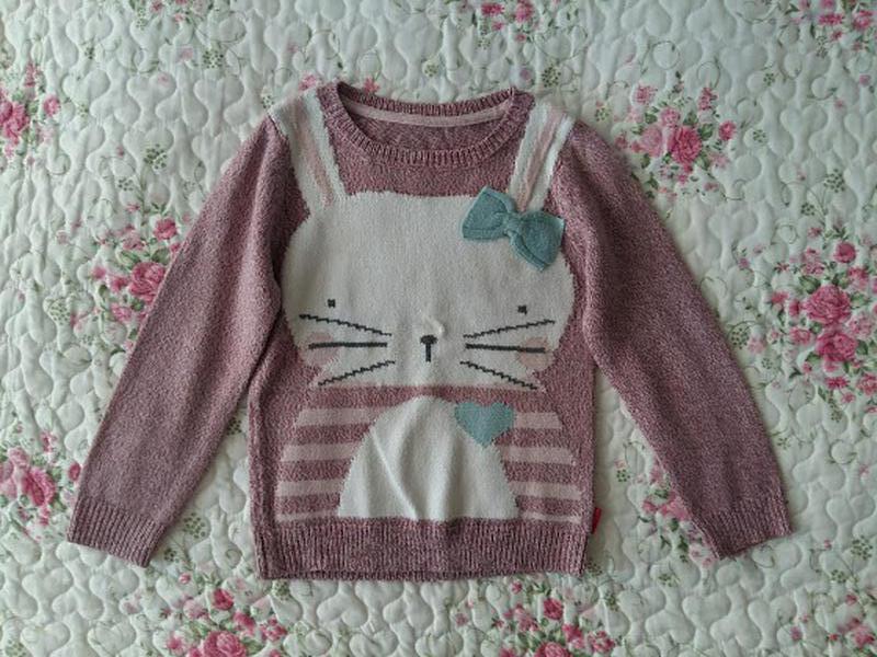 Очень миленький свитер с зайкой. Размер 5-6 лет. Мерки: ПОГ 33 см, длина 43 см, плечи 27 см, рукав 41,5 см. Состояние отличное.