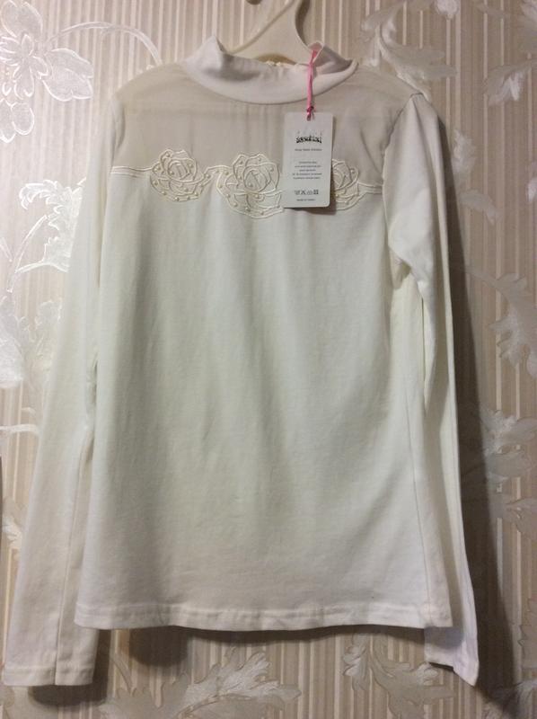 Новый гольф, покупали в школу, но не успели поносить-выросли Мягкий хлопок. Цвет слоновой кости-белый. Спереди вставка прозрачная и декорированые розочки Рукав 58 см В груди 39*2 см Производство Турция