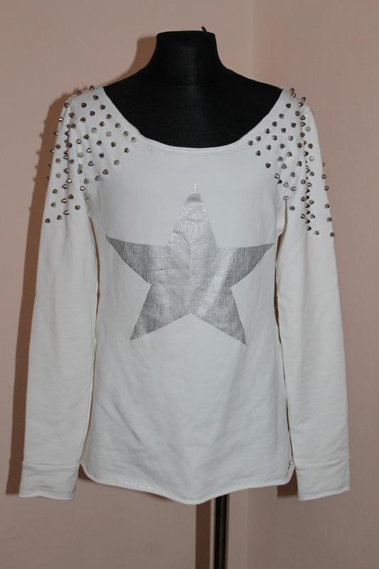 Світшот білого( чуть брудного білого) кольору присланий з Іспанії дочці в подпарунок, а то не її стиль, тому продаю. Розмір М вказано, На С більне підійде. Довжина-60см від плеча,плечі-37см, рукав від плеча-59см, пог-42см, пот-37см, поб-47см.Еластичний, добре тягнеться.