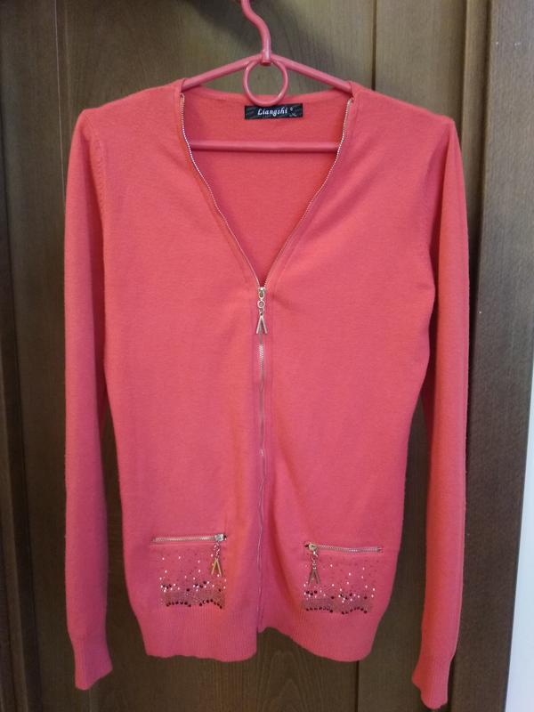 Кофта кашемировая на красивой молнии, удобная и мягкая. Карманы декоративные, украшенные молниями и стразиками. Длина: 62 см, обхват по линии талии: 74 см, ширина плеч: 34 см, длина рукава: 62 см (манжет можно завернуть).