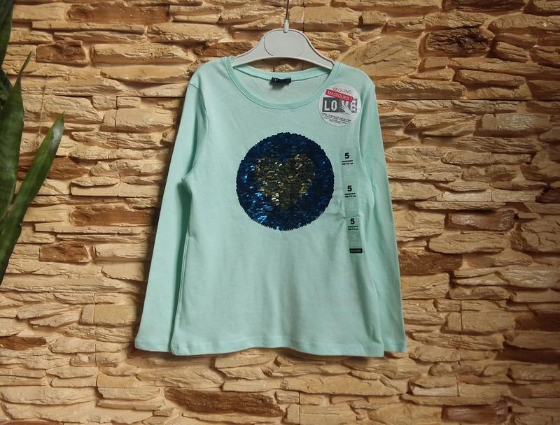 Красивый регланчик нежного мятного цвета с пайетками-перевертышами. Размер 108-113: •длина - 41 см; •плечи - 27 см; •ПОГ - 28,5 см; •длина рукава от плечевого шва - 39 см, от подмышки - 28 см.