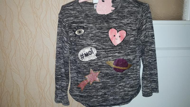 Стильный свитшот девочке 5-6 лет ,смотрится супер ,нашивки с блестками ,состояние идеал.Длина по переду 39,5 см ,по спинке 43см ,рукав 34,5 см,Пог 33см