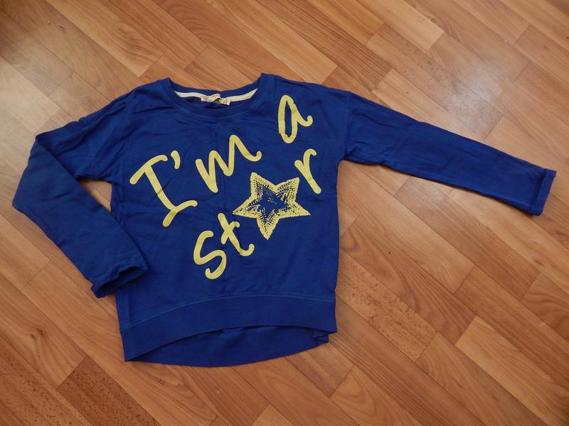 Хорошенький свитшот для девочки. Вещь стираная, без дефектов, почти не носили. Замеры: длина 49 см по спинки (впереди 46 см), рукав от плечевого шва 40 см, от подмышки до подмышки 44 см, тянется, рассчитано на 8-9 лет.