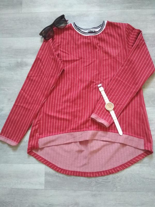 Кофта свободная в полоску, есть маленький дефект на фото. На ярлыке указано 164/14. Замеры: рукав 55 см, плечи 34 см, длина спинка 64см, перёд длина 47 см, ширина под руками 43 см.