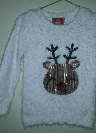 Пушистый теплый свитерок девочке 7-8 лет по бирке,принт из блестящих пайеток .Очень приятный к телу,мягусенький,отличное состояние.Длина 51см,Пог 36,5 см ,рукав 43см