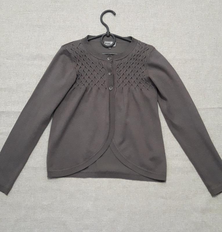 Кардиган на 134-140 Цвет хаки Застегивается на 3 пуговки сзади аппликация ангела Состояние очень хорошее Состав ткани 65% бамбук, 18% полиамид, 17% коттон-хлопок Замеры: длина 47 э ширина 35, рукав 52