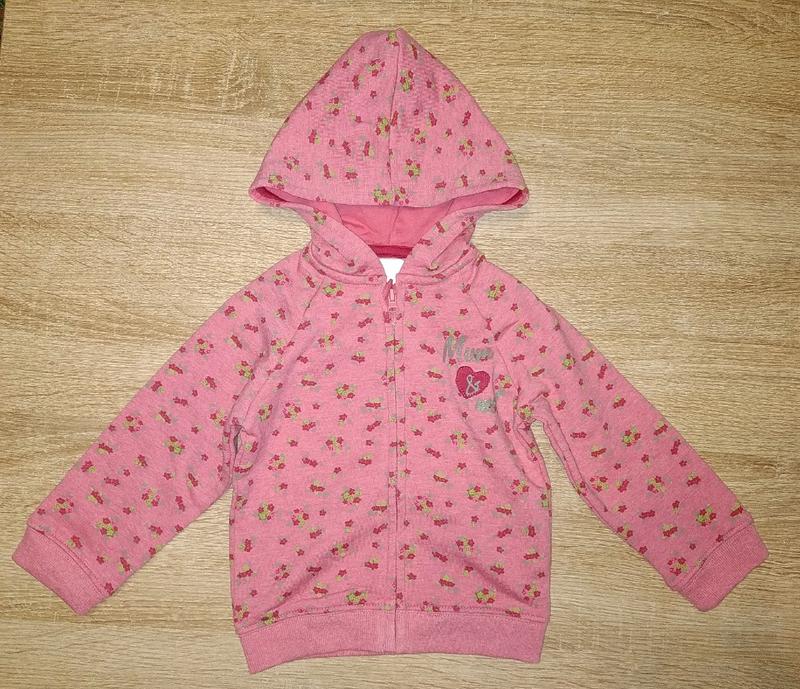 Теплая кофта для девочки на 12-18 месяцев, фирма Sfera. Цвет приглушенный розовый в цветочек. Состав: внешняя сторона-100% хлопка, внутренняя сторона : 63 полиэстера, 34 хлопка+3 эластана. Замеры для размера 12-18 месяцев (74-82 см): длина 32 см, длина рукава от горловины 34, ширина между подмышками 26 см, ширина по низу кофты 23 см. №4/2,5