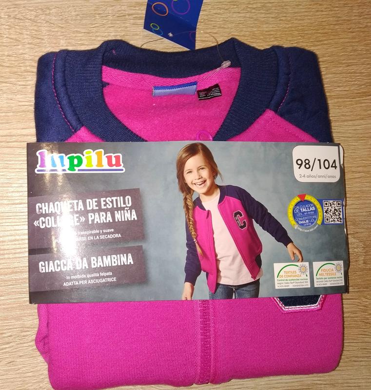 Толстовка бомбер производства немецкой ТМ Lupilu. Ткань топа - трикотаж на флисе. Рукав -двойная стеганая в виде звездочек ткань. Состав флиса::80 % хлопка и 20-полиэстера. Состав топа и рукава: 80 % хлопка, 20 полиэстера. Размер для 2-4 лет (98-104 см): длина по спинке 38 см, длина рукава от горловины 44 см, ширина между подмышками 33 см, ширина внизу по резинке 26 см. №4/3